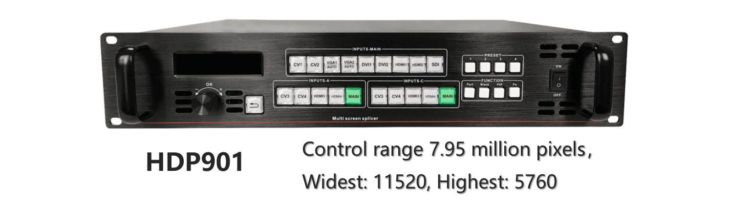 Hdp901 - это гибкое и многофункциональное светодиодное устройство для обработки и сращивания видео, которое имеет 3-канальное сращивание и 1-канальный выход для мониторинга.